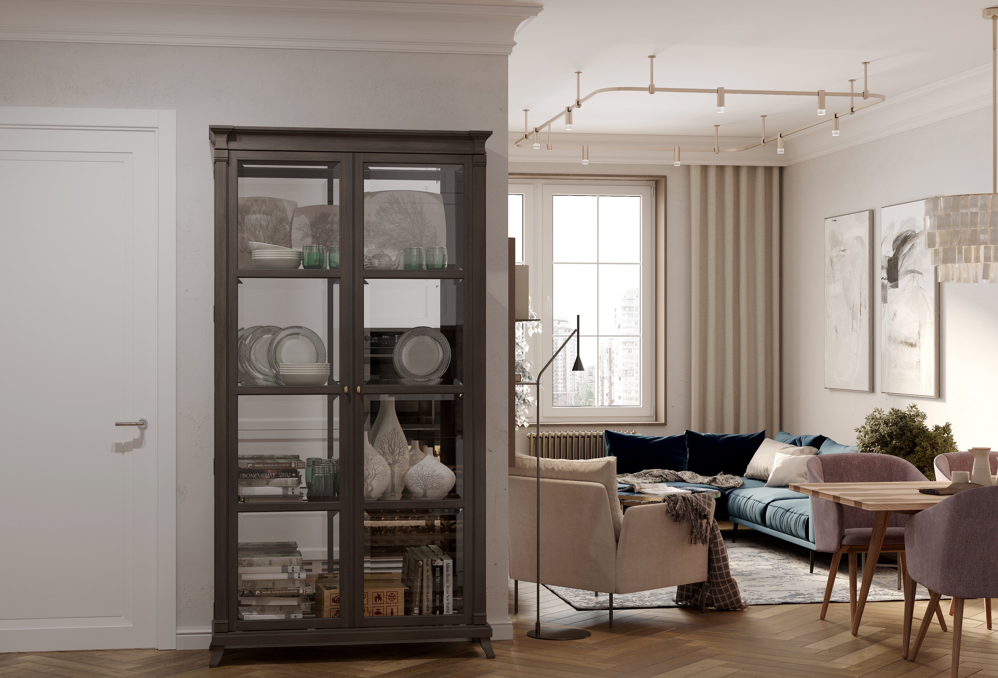 q Полы - ламинат с плинтусамиq Стены - обои с финишной окраскойq Потолки - натяжныеq Санузлы - напольная плитка, полотенцесушители, унитазы со встроенной инсталляцией, теплый пол, умывальник, ванна, смесителиq Электроразводка, в том числе слаботочная, розетки и выключателиq Точечные светильники (споты), контурная подсветка и теневые потолкиq Разводка под кондиционирование в каждом помещенииq Межкомнатные двери и раздвижная полупрозрачная перегородка для дополнительной инсоляцииq Декоративный ремонт на балконе, подготовка под теплый полq Шторные карнизы скрытой установки с нишевой подсветкой